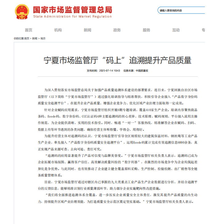 宁夏市场监管厅“码上”追溯提升产品质量