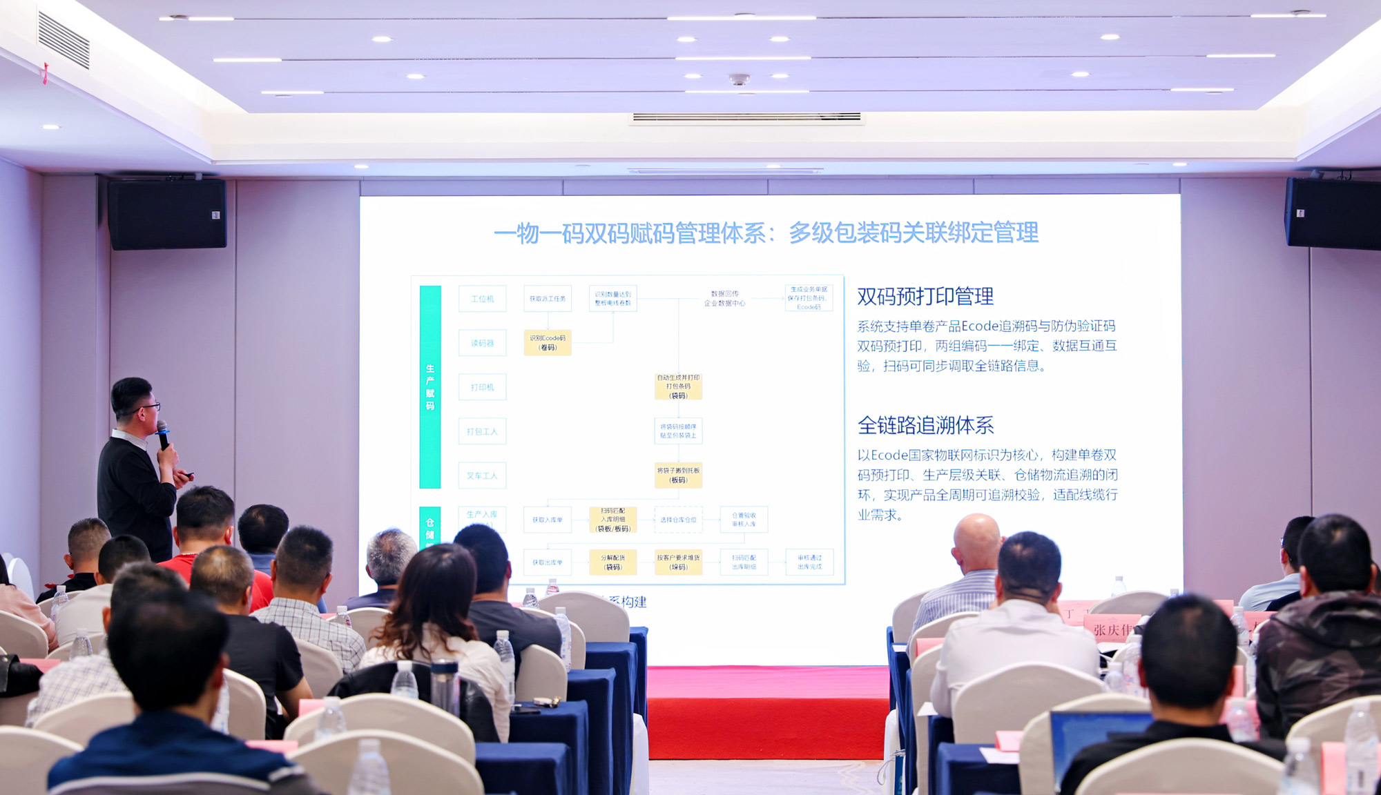 上海缆新客户成功部高级主管李杰围绕智能合格证及生产许可证质量安全追溯制度,深度解读2025版生产许可证细则追溯要求,推出以Ecode码+防伪码双码融合为核心的全链路追溯方案,实现“生产—仓储—物流—渠道—终端”五级编码关联、防伪防窜、营销激励、数据可视化一体化,确保企业扫码成功率≥99%、追溯合规100%,从技术层面解决非标、窜货、假货等行业顽疾,助力企业顺利通过生产许可证核查与监管验收。